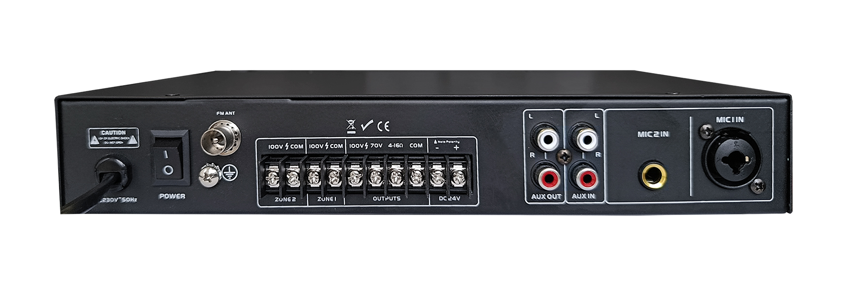 • 2 regulovateľné zónové výstupy (100 V), každá zóna s individuálnym ovládaním hlasitosti,