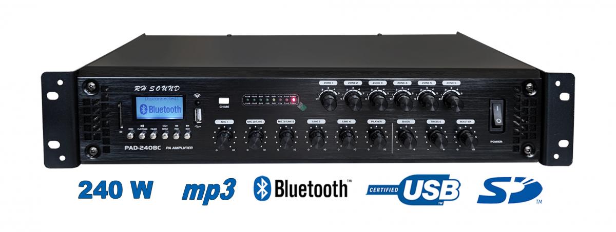 Moderná digitálna (Class-D) rozhlasová ústredňa pre všestranné ozvučenie so zabudovaným MP3 prehrávačom z USB a SD, prehrávaním MP3 cez BLUETOOTH a diaľkovým ovládačom.