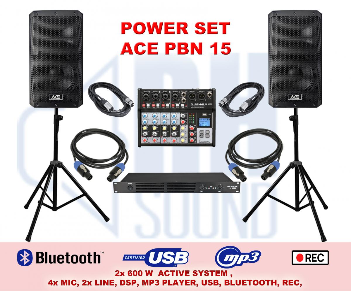 • 2x Satelitné reproboxy ACE PBN-15 s výkonom RMS 2 x 400 W / 8 Ohm, MAX 2 x 600 W / 8 Ohm,