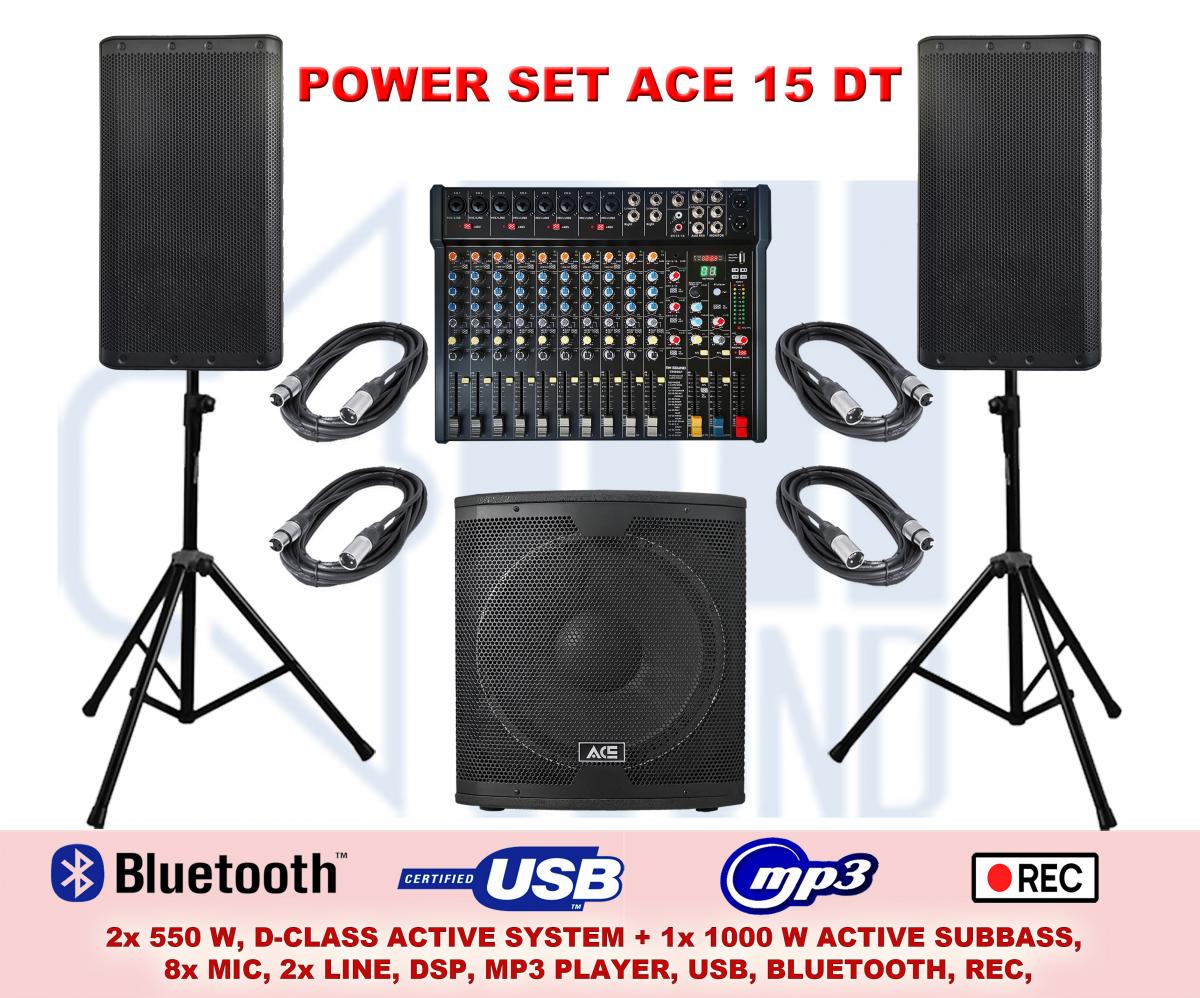 Vynikajúca 2x 550 + 1x 1000 W zostava pre muzikantov, disco kluby, ozvučenie koncertov, so širokou škálou možností nastavenia zvuku. S mixážnym vstupom s 8 mikrofónovými vstupmy, so vstavaným MP3 prehrávačom s podsvietením displejom s funkciou prehrávania a nahrávania. Môžete prehrávať alebo nahrávať hudbu z/na USB disc, alebo prehrávať cez Bluetooth. Zabudovaný zvukový procesor v reproboxoch s možnosťou rôznych nastavení, mixážny pult s 24-bit stereo FX efektovým procesorom s možnosťou nastavenia úrovne, počtu a dĺžky opakovaní.